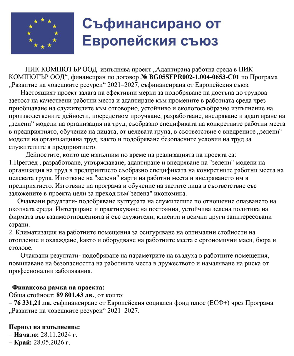 През 2013 година Пик Компютър реализира проект за подобряване условията на труда, по оперативна програма "Развитие на човешките ресурси".