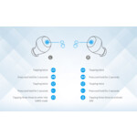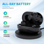 - Живот на батерията: ~5 часа/слушалка, 45mAh Li-polymer, ~25 часа/ с кутия за зареждане, 500mAH Li-polymer