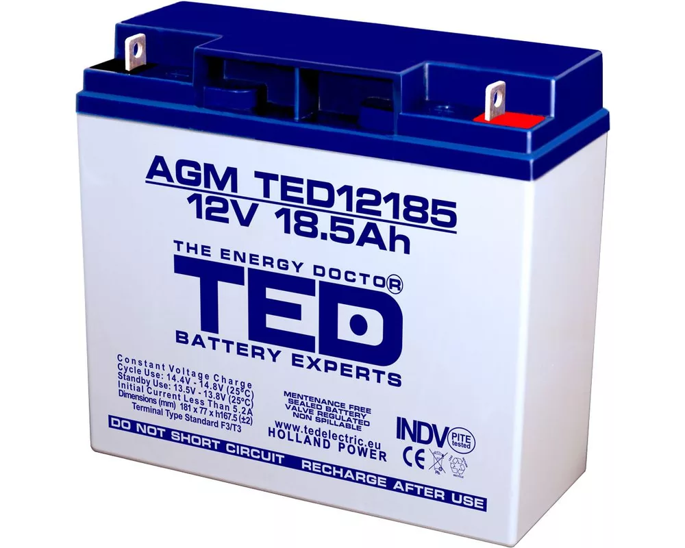 - Оловна батерия TED ELECTRIC, 12V, 18.5Ah, 181/ 76/ 167 mm, AGM (ID: 904013)
