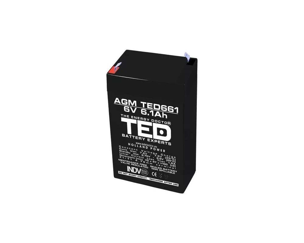 - Оловна Батерия TED ELECTRIC, 6V, 6.1Ah, 70/ 47/ 100 mm, AGM (ID: 904070)