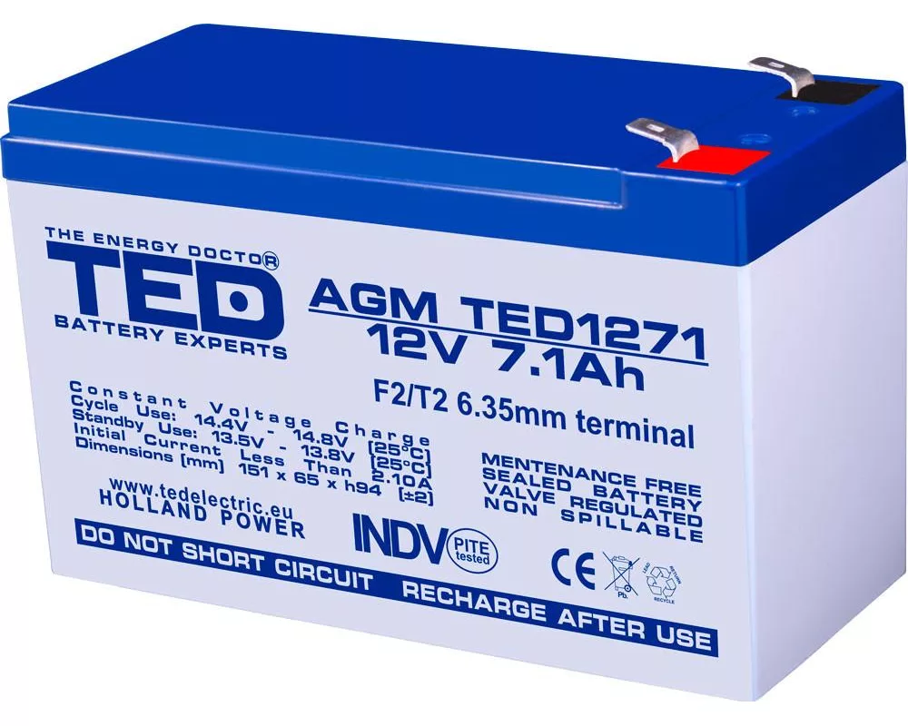 - Оловна батерия TED ELECTRIC, AGM, 12V, 7Ah, 151/ 65/ 94 mm, Терминал2 (ID: 904047)
