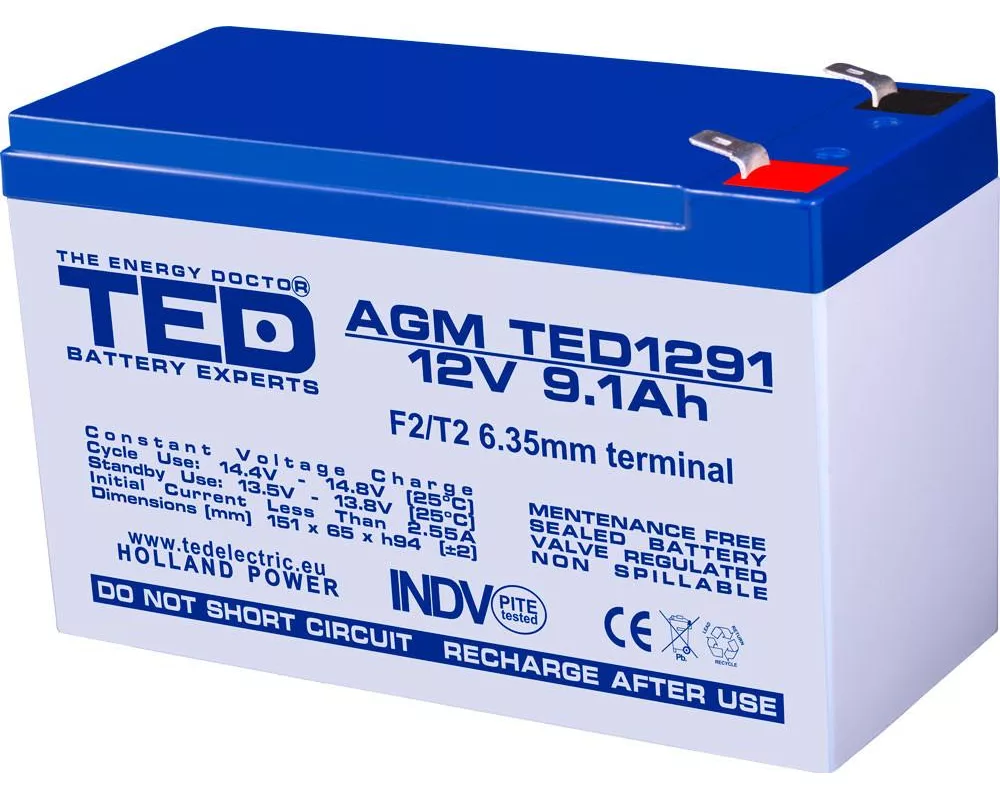 - Оловна батерия TED ELECTRIC, AGM, 12V, 9Ah , 151/ 65/ 94 mm, Терминал2 (ID: 904048)