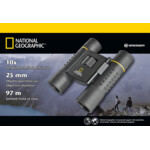 Beautifully designed Roof prism Bresser National Geographic 10x25 binoculars are a perfect super-compact companion for adults and children during a walk or hike. With a compact body made of plastic and special inserts for a secure grip, the binoculars weigh less than 200 grams. Objective lenses made of BK-7 glass with anti-reflective coating collect enough light to successfully conduct observations in good light conditions and provide 10x magnification of distant objects. To adjust the diopter difference between the left and right eyes, use the special wheel. The convenient central focusing wheel allows you to accurately focus on the desired object and see it in smallest detail. Bresser National Geographic 10x25 Binoculars are the perfect choice for a sunny day outdoors. Neck strap and pouch are included.