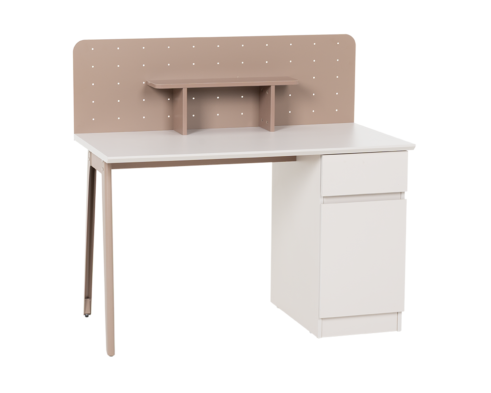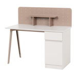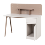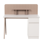 Бюро BAIS впечатлява с изчистен и модерен дизайн, който се вписва отлично както в детски, така и в юношески интериор. Практичното разпределение включва чекмедже и шкаф с вратичка, които осигуряват място за съхранение на учебни материали и аксесоари. Бледорозовият гръб с декоративни отвори и малък рафт допринася не само за функционалността, но и за естетиката на бюрото. Детайлите в пастелни тонове и наклонените крака придават характер и създават усещане за уют. Пълна информация за размерите и характеристиките на модела ще намерите в таблицата в таб/поле "Техническа информация".