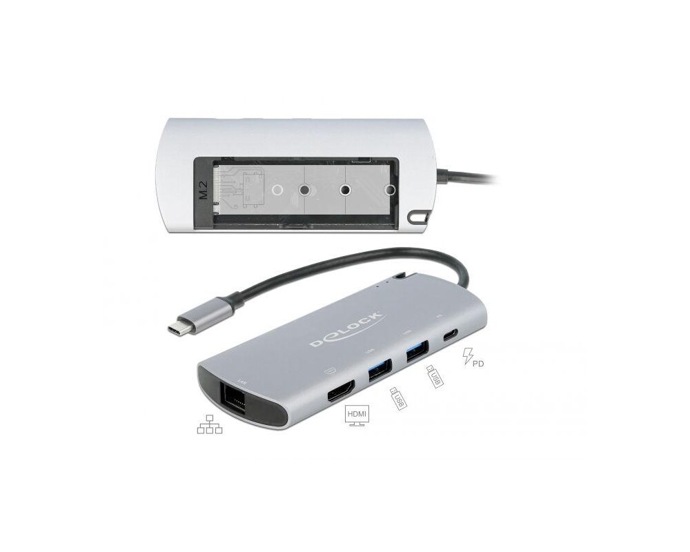- Докинг станция Delock USB-C, M.2 слот за SSD, HDMI, Gigabit LAN, 2xUSB-A, USB-C, Сива (ID: 521408)