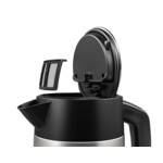 Перфектна хигиена и лесно почистване. Благодарение на подвижния филтър, никакви бучки варовик не попадат във водата, тъй като филтърът е особено лесен за изваждане и почистване. Термоканата загрява независимо от това къде ще я поставите на основата. 360-градусовата базова станция означава повече гъвкавост и удобно положение на дръжката. Ако кабелът е свързан към основата, каната може да се носи, където имате нужда. Капакът на този практичен чайник може да се отвори с едно докосване на бутон. Спестете време и енергия с индикатора за една чаша.