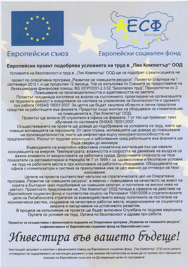 През 2013 година Пик Компютър реализира проект за подобряване условията на труда, по оперативна програма "Развитие на човешките ресурси".