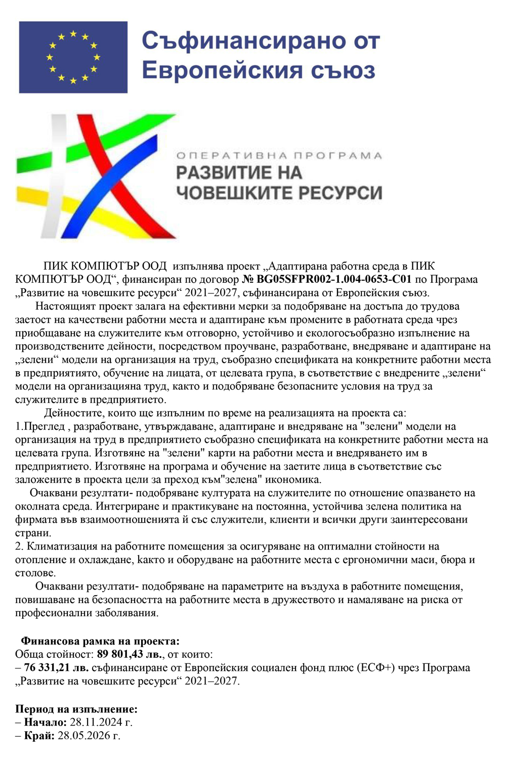 Настоящият проект залага на ефективни мерки за подобряване на достъпа до трудова заетост на качествени работни места и адаптиране към промените в работната среда чрез приобщаване на служителите към отговорно, устойчиво и екологосъобразно изпълнение на производствените дейности, внедряване и адаптиране на „зелени“ модели на организация на труд, както и подобряване безопасните условия на труд.