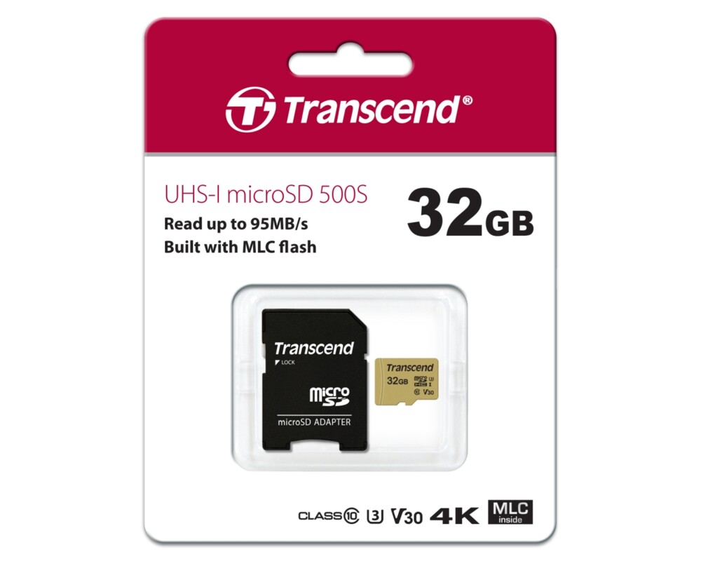 C10 U3 V30 Transcend's 500S memory cards are manufactured with top-tier MLC NAND flash.. The cards offer impressive transfer rates and stable video recording without dropping frames making them ideal for action and drone cameras. Built for extremes: Waterproof Temperature proof Static proof X-ray proof Shock proof RecoveRx software |
