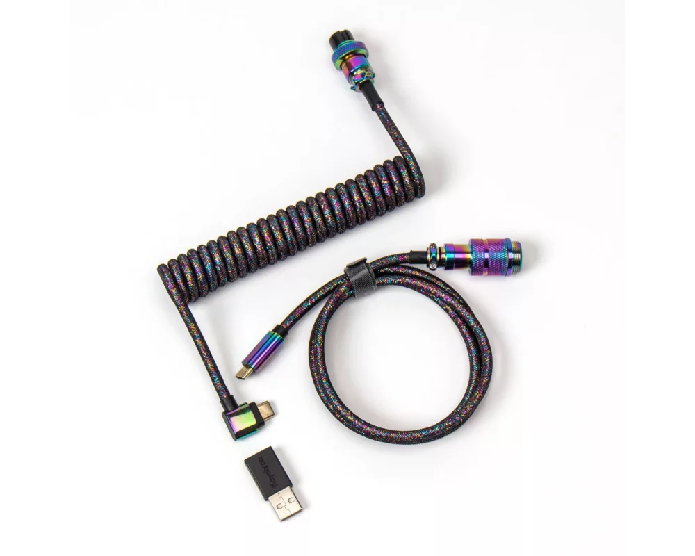 Геймърски аксесоари Кабел за клавиатура Keychron Colorful Premium Coiled Angled, USB-C - USB-C, Rainbow Plated Black ACC-Cab-7
