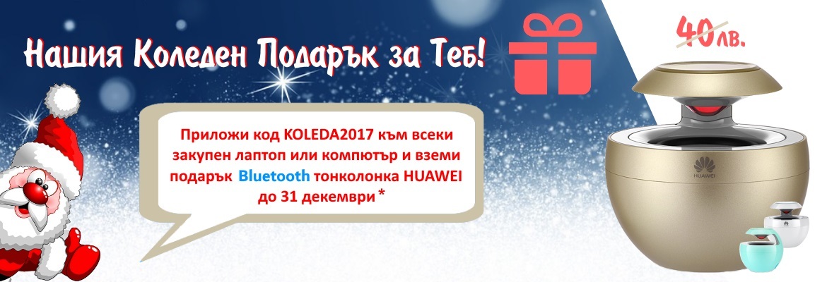 - От 12.12.2017г. до 31.12.2017г. всеки клиент закупил Лаптоп или Настолен компютър от онлайн магазина на PIC.bg или в някой от физическите магазини в Пловдив, София и Бургас, ще получи подарък една от 100-те тонколонки Huawei Bluetooth Speaker AM08. За целата е небходимо при онлайн поръчка да бъде приложен промо код KOLEDA2017 или да бъде предоставен при покупка във посочените физически магазини.