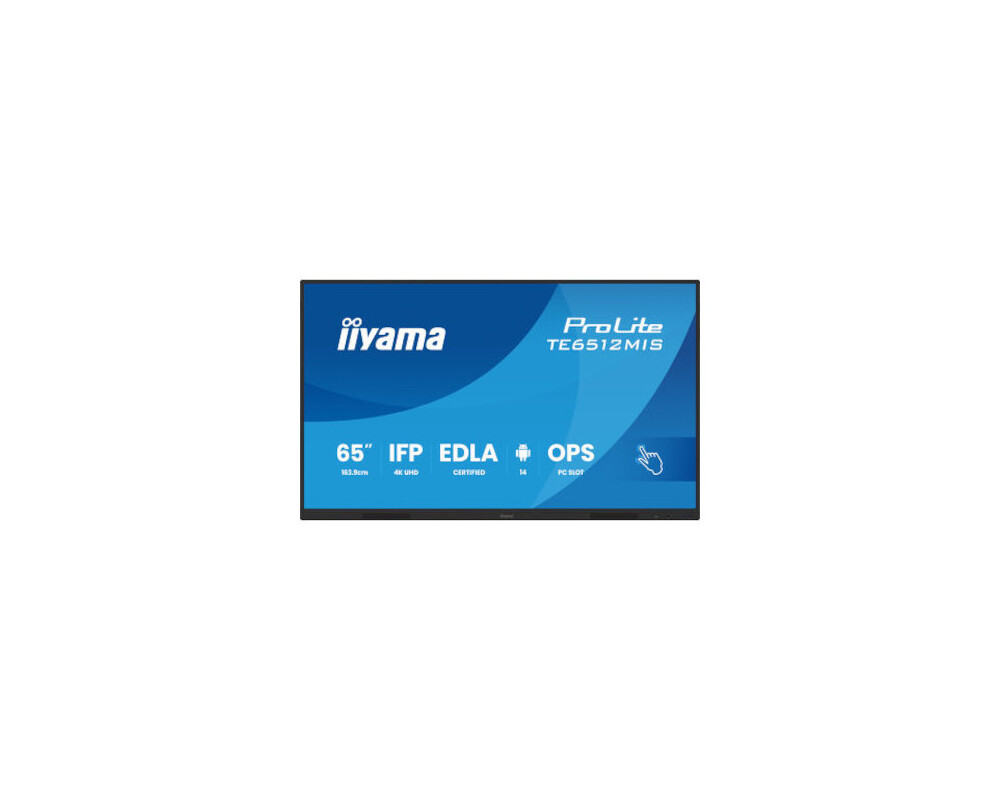 Дисплей IIYAMA TE6512MIS-B4AG, 65'' VA panel, Google EDLA, AG, UHD 3840x2160, 400cd/m2, 5000:1, 6.5ms, PureTouch-IR, VGA, 2x HDMI, DP, 2x USB-C, RS232c, 2x LAN, 4x USB, HDMI out, IR, Speakers, Octa Core, 8GB, 128GB, Android 14, iiWare 13E, WiFi-6, BT, OPS slot, VESA, Black
