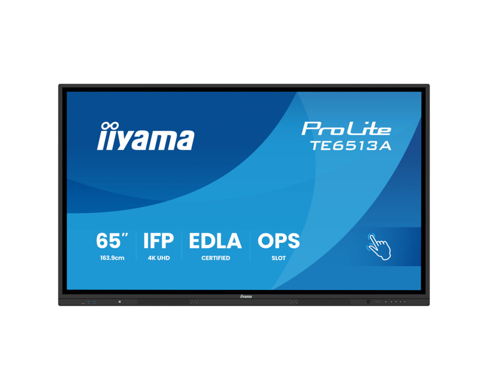 Дисплей IIYAMA TE6513A-B1AG, 64.5'' IPS panel, Google EDLA, AG, UHD 3840x2160, 450cd/m2, 1200:1, 8ms, PureTouch-IR+, Android 14, iiWare 21E, iiControl, Quick Radial Menu, 2x HDMI, DP, 2x USB-C, 2x LAN, 3x USB, RS232C, HDMI out, Speakers, WiFi-6, BT, Quad Core A73, 8GB, 128GB, OPS slot, Black
