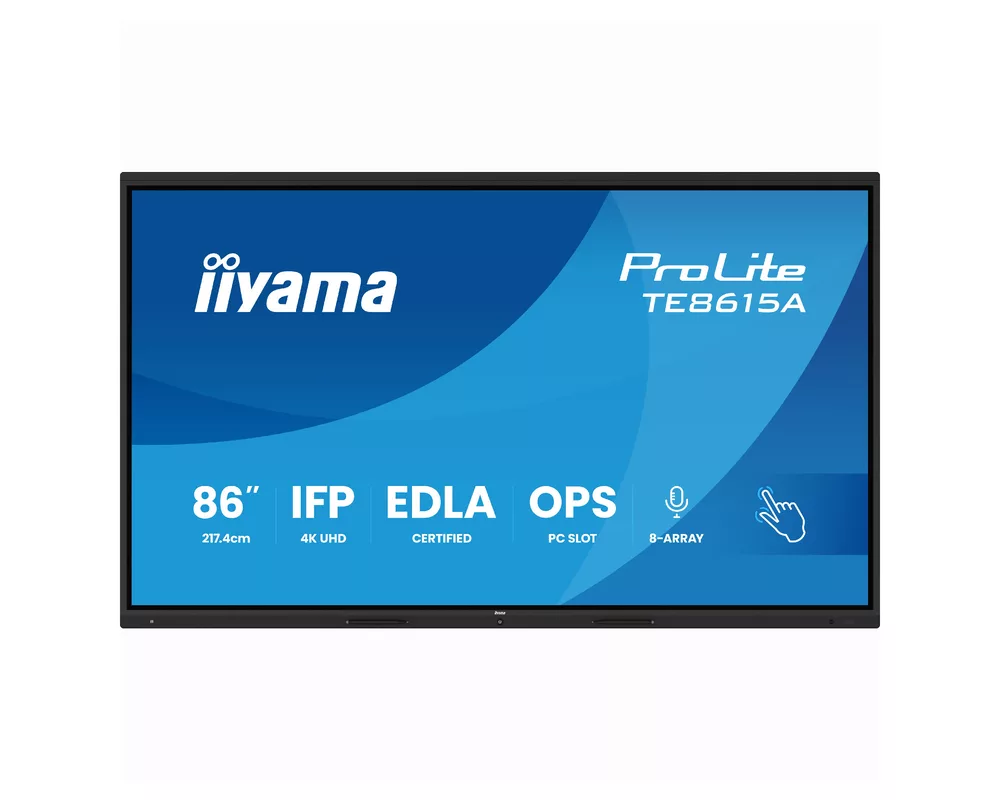 Дисплей IIYAMA TE8615A-B2AG, 85.6 inch IPS panel, Google EDLA, AG, 3840x2160, 550cd/m2, 1200:1, 8ms, DeepContrast-IR++, 2x HDMI, DP, USB-C, RS232c, LAN, 4x USB, USB-C out, HDMI out, Mic, Speakers, OPS slot, Android 14, WiFi, BT, Octa Core, Black