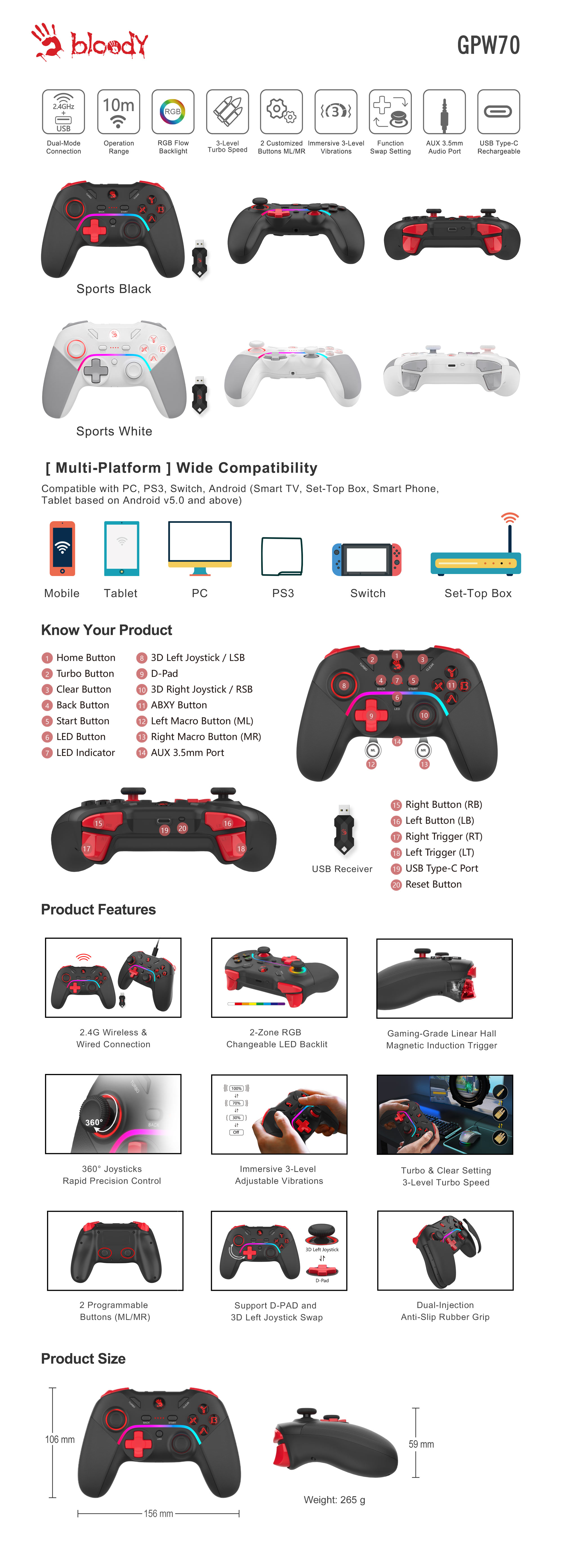 Джойстици и Геймпадове Геймърски контролер A4tech Bloody GPW70, Жичен и безжичен, RGB, Бял A4-CON-GPW70-WH