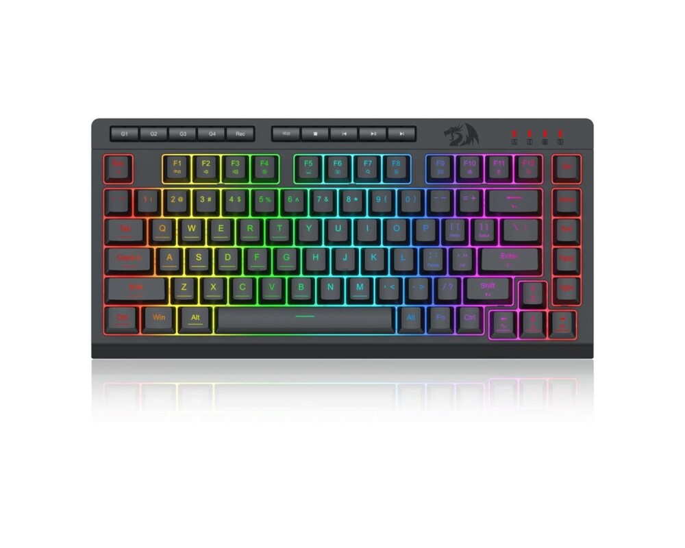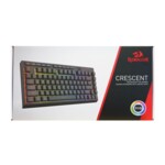 Redragon Crescent геймърска клавиатура, черна, с RGB подсветка, 82 клавиша, 26 conflict-free клавиша (26-key rollover), RGB LED подсветка на клавишите, 5 мултимедийни клавиша, 4 MACRO клавиша, възможност за деактивиране на WIN клавиш при игра, софтуер за конфигурация на клавиатурата, USB конектор, размери: 326 × 156 × 38 мм, тегло: 0.48 кг