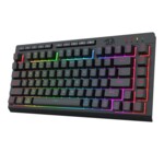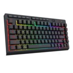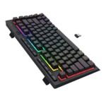 Redragon Crescent Pro геймърска механична клавиатура, черна, с RGB подсветка, 82 клавиша, 26 conflict-free клавиша (26-key rollover), RGB LED подсветка на клавишите, Bluetooth протокол 5.0, възможност за едновременно свързване на 3 устройства (избор чрез комбинация от FN + 1, 2, 3), безжичен протокол 2.4 GHz, 5 мултимедийни клавиша, 4 MACRO клавиша, възможност за деактивиране на WIN клавиш при игра, софтуер за конфигурация на клавиатурата, USB конектор, размери: 326 × 156 × 38 мм, тегло: 0.57 кг