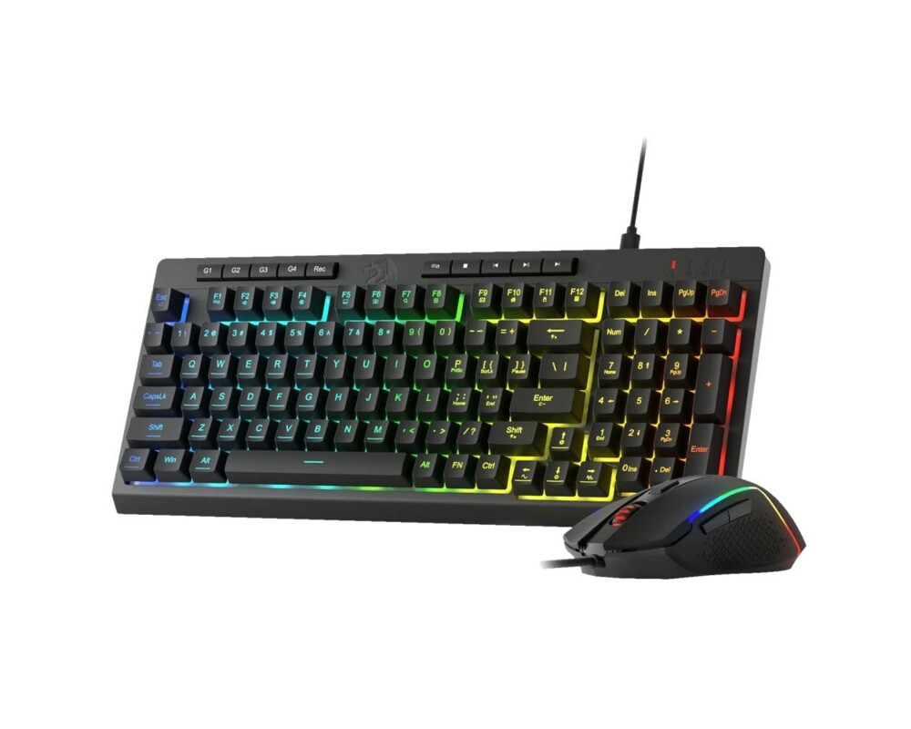 Redragon S141 е черен геймърски комплект клавиатура и мишка с RGB подсветка.