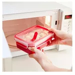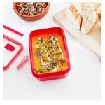 Кутията за храна Tefal - Clip & Micro е изключително удобен и необходим аксесоар. Тя е 100% устойчива на течове и е перфектното решение, когато пренасяте храната си на работа, на път или просто съхранявате остатъци в хладилника и фризера. Изработена от висококачествена, издръжлива пластмаса, която може да се използва в микровълнова печка, съдомиялна машина или фризер. 100% запечатаният капак осигурява 2 пъти по-дълга свежест на съхраняваната храна и безопасност срещу разпиляване. Снабдена с клапан на капака за загряване в микровълнова. За производството са използвани само безопасни за здравето материали, несъдържащи BPA. Подходяща и за съхранение на бебешка храна.