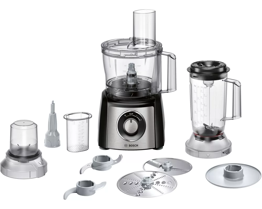 MultiTalent 3 - компактен и многостранен кухненски помощник с повече от 50 функции. Превръща готвенето в детска игра. Продуктите се раздробяват прецизно, шейкове и смутита се миксират перфектно: постоянно добри резултати чрез нож MultiLevel6 с три двойни остриета. Практично: аксесоарите се прибират в купата и по този начин уредът е винаги готов за работа. Благодарение на разбираеми обозначения аксесоарите се монтират бързо и лесно. Безпроблемно мелене - например на кафе и подправки - със специална мелница. Повече от 50 функции: рендосване, рязане, мелене, надробяване, миксиране и много повече - благодарение на многостранни аксесоари: миксер, чопър, различни режещи накрайници (напр. нож MultiLevel6). Аксесоари, подходящи за миене в съдомиялна машина: лесно и комфортно почистване.