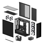| ДОПЪЛНИТЕЛНИ | Enables vertical GPU installation with a 160 mm PCIe Gen 4 riser cable Five pre-installed fans Compatibility for 120 or 140 mm Fans Supports Two 420 mm Radiators Magnetic Mesh Filters Flexible Mounting for Up to Six Drives Includes Accessory Box 3D Cable Pass-Throughs for Improved Aesthetics Clean Cable Management |