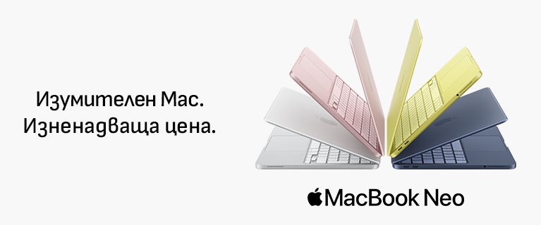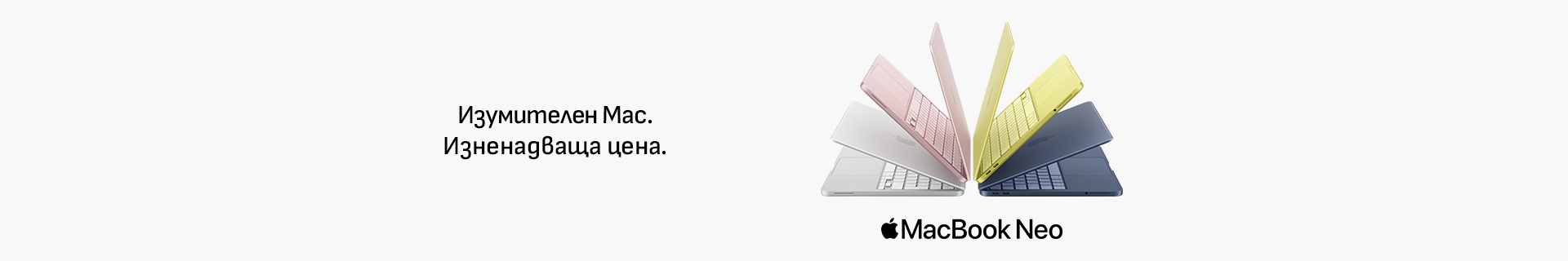 Представяме MacBook Neo - невероятен Mac на изненадваща цена. С издръжлив дизайн, красиви цветове и мощни функции, той е магичен нов начин да се влюбиш в Mac, всеки ден. Добре дошъл в семейството.