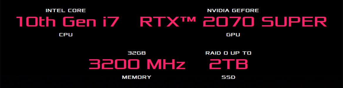 Работете и играйте със скорост на мощна машина, оборудвана да доставя вълнуващо преживяване. GeForce RTX™ 2070 SUPER GPU прави бързият гейминг плавен, давайки ви конкурентно предимство на бойното поле. Мощният процесор от 10-то поколение Intel® Core CPU, сдвоен с до 32 GB DDR4-3200 RAM, изпълнява всяка задача. С 2-та бързи M.2 NVMe SSD диска в RAID 0, приложенията във вашата библиотека се зареждат с базова скорост. Мястото за трето SSD улеснява добавянето на терабайти към общата ви памет, за да носите масивната си медийна колекция навсякъде.