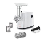 Многофункционален и компактен помощник за различни рецепти. Ефективна многофункционална месомелачка, която се справя с до 1,9 kg/мин благодарение на мощния мотор (максимална блокирана мощност на мотора 1600 W). Не се безпокойте за запушванията – функцията за обратно движение ви позволява да смилате дори твърдо месо без проблем. 3 решетки от неръждаема стомана – фина, средна и едра – за различни видове смилане. Наслаждавайте се на разнообразие от ястия и дори сокове благодарение на приставката за сок и многофункционалните аксесоари за бързо нарязване и настъргване. Компактен и ефективен уред, който ще се превърне в задължителен помощник за всички рецепти с месо.