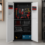 Металният шкаф Carmen CR-1226 L SAND предлага практично и надеждно решение за подреждане на инструменти в работна среда. Изработен е от прахово боядисан метал и разполага с 3 регулируеми рафта, всеки с товароносимост до 40 кг. От вътрешната страна на вратите има куки за окачване на инструменти и по един лост на всяка врата, подходящ за работни кърпи. Във вътрешното отделение са монтирани още 4 куки, с възможност за добавяне на допълнителни (не са включени в комплекта). Конструкцията позволява лесна организация и бърз достъп до всичко необходимо. Пълна информация за размерите и характеристиките на модела ще намерите в таблицата в таб/поле 'Техническа информация'.