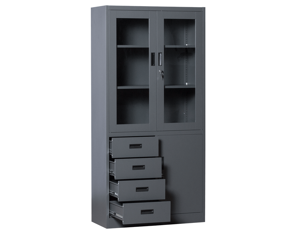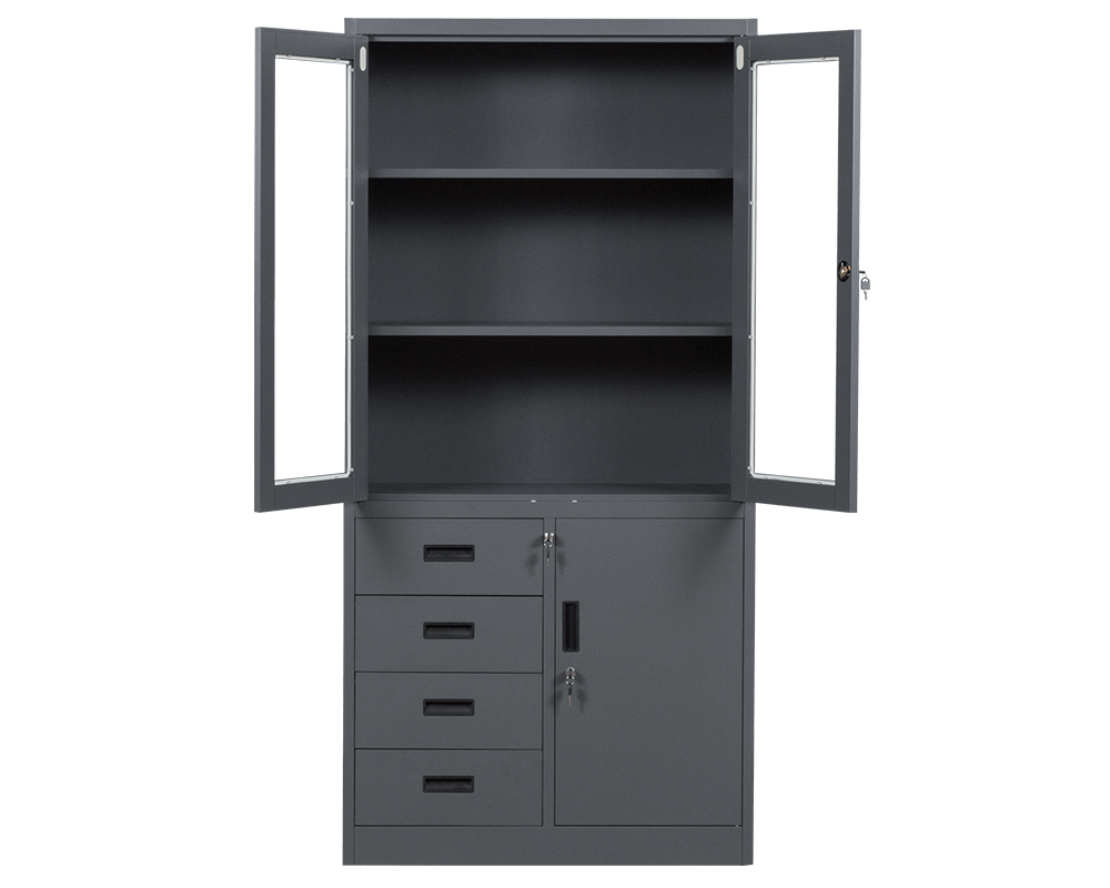 Carmen CR-1278 E L SAND е практичен метален шкаф за документи със заключване и удобно разпределение, включващо: 1 голям шкаф със стъклени врати и 2 рафта, един по-малък шкаф с 1 рафт и 4 чекмеджета. Размери: ш. 90 см / д. 45 см / в. 185 см. Пълна информация за размерите и характеристиките на модела ще намерите в таблицата в таб/поле "Техническа информация".