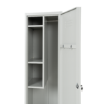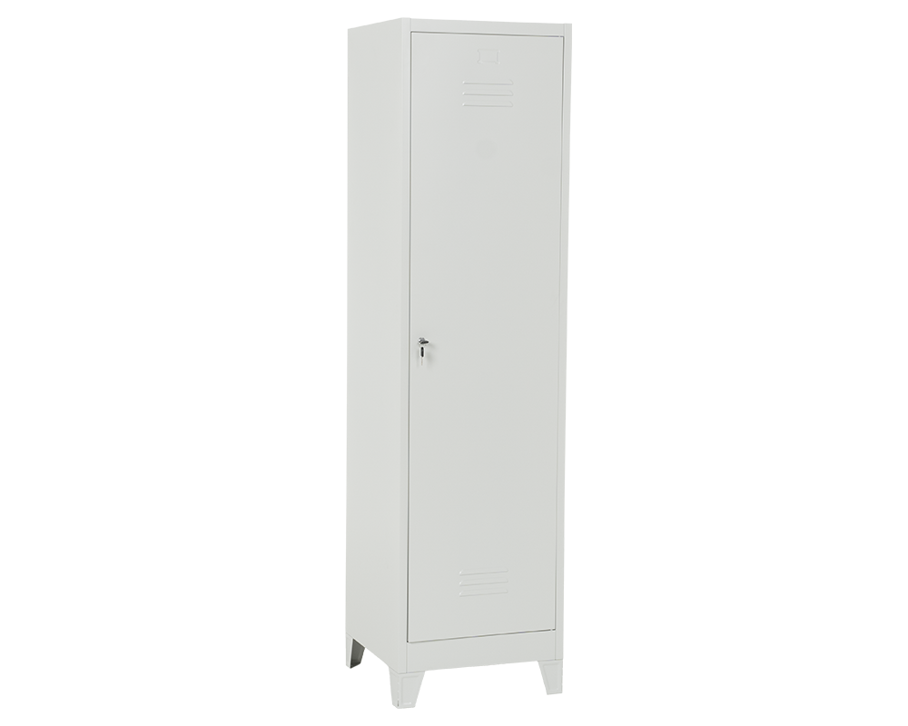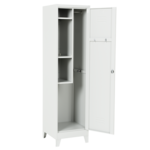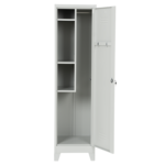 Металният санитарен шкаф Carmen CR-1284 E J е универсално решение за съхранение, подходящо за офиси, съблекални и санитарни помещения. Изработен от праховобоядисан метал със светлосиво покритие, той предлага три здрави рафта с товароносимост до 40 кг, лост за закачалки и два кукички за допълнително удобство. Вентилационният отвор осигурява циркулация на въздух, а заключващата се врата гарантира сигурност. Пълна информация за размерите и характеристиките на модела ще намерите в таблицата в таб/поле "Техническа информация".
