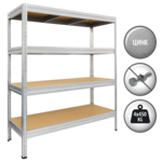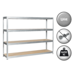 MEGA е универсален метален стелаж с размери 177x240x60 см и максимално натоварване на рафт до 450 кг. Той е идеално решение за съхранение на тежки и обемни предмети във вашия дом или на работното място. Неговите 4 регулируеми рафта са изработени от МДФ и допълнени с укрепващи елементи. Металният стелаж MEGA се сглобява лесно и бързо, благодарение на безболтовата система за монтаж. Пълна информация за размерите и характеристиките на модела ще намерите в таблицата в таб/поле "Техническа информация".