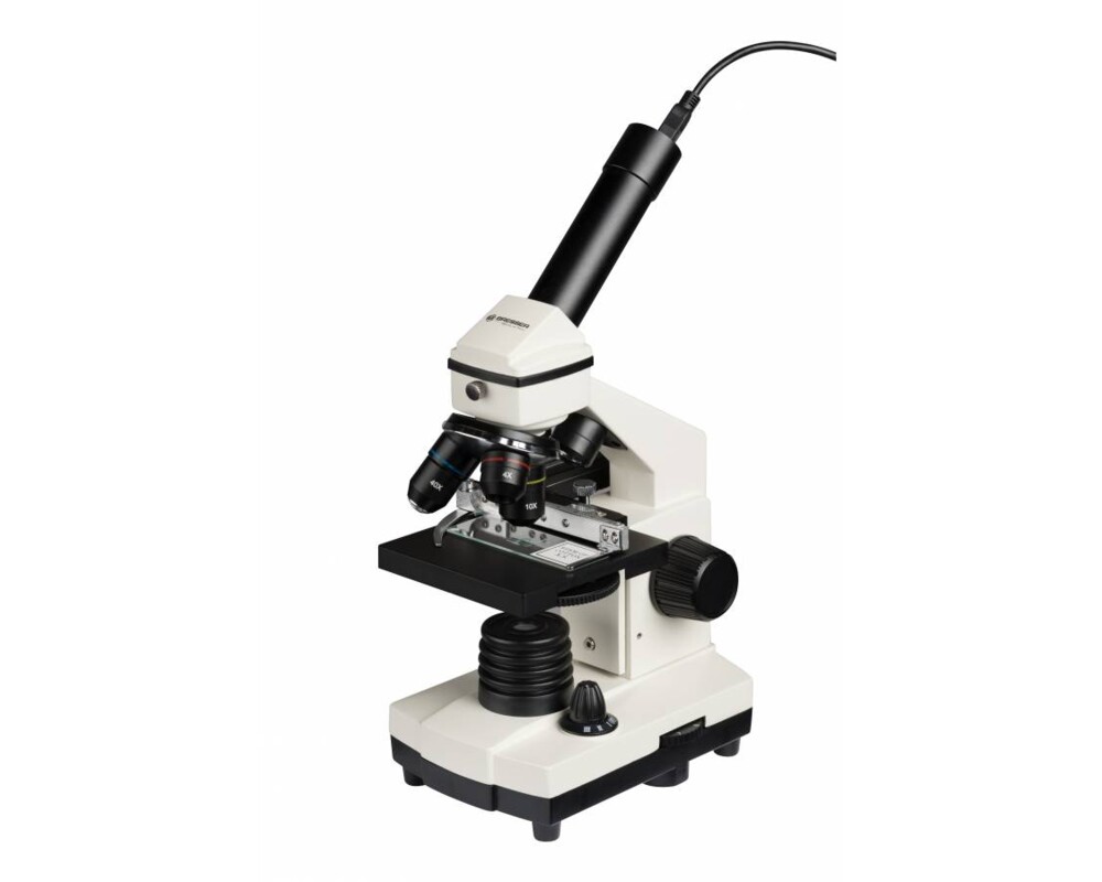 Bresser Biolux NV 20x–1280x Microscope is an excellent microscope for beginners. You can adjust the magnification from 20x to 1280x due to 3 objective lenses and 2 interchangeable eyepieces that come in the kit. This microscope features a Barlow zoom lens that allows for smooth variable magnification; maximum magnification is 1280x. The mechanical desk allows for moving the microscope samples for better observations. This microscope uses combined LED illumination for even lighting. You can observe transparent samples in transmitted light and non-transparent samples in reflected light. This microscope is powered by batteries (3x AA).