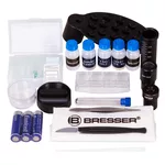 The power supply is provided by batteries (three pieces type AA), so that microscopic work can also be carried out in the vicinity without a socket. The accessories already include permanent specimens and 5 empty slides and cover glasses for making your own specimens. The set also includes a preparation set consisting of a MicroCut, a knife, a pair of tweezers, a stick and a tube.
