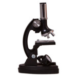 The microscope features a monocular head and a revolving nosepiece with three objectives that provide three fixed magnifications: 300x, 600x, and 1200x. The device is equipped with built-in lower illumination that allows for observations of transparent microscope samples in transmitted light. For example, you can observe microorganisms in a drop of aquarium water or study the cellular structure of an onion peel. The illuminator is rotatable – one side has a mirror (used in sufficient daytime lighting), and the other side has a light diode.