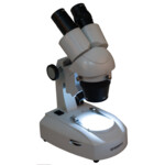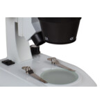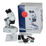 Bresser Researcher ICD LED 20–80x Microscope is an all-purpose instrument: it is a stereo model that also serves as a biological one. The device is equipped with upper and lower LED lights that can operate independently or both at once. Brightness level is adjustable. The binocular head is 360° rotatable for comfortable observations. The microscope comes with two pairs of wide field eyepieces with 10x and 20x magnification. The diopter adjustment mechanism allows users to adjust the instrument to their individual needs. The microscope is powered by an electrical outlet; however, the device can work completely autonomously.