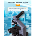Микроскопът е с ахроматична оптика, която осигурява контрастно, остро и детайлно изображение без оптични аберации. Благодарение на включените окуляри, микроскопът създава плоско и широко зрително поле, което дава възможност за наблюдение на удължени обекти със сложна структура. Главата на монокулярния микроскоп може да се завърта на 360°. Микроскопът е с диапазон на увеличение 40-1600x. Обективът с увеличение 100x дава възможност за използване на метода с имерсионно масло; в комплекта е включена бутилка с имерсионно масло.