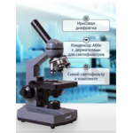 Микроскопът е с класическа монокулярна глава и револверна глава за четири обектива. Комплектът включва широкоъгълен окуляр и ахроматични обективи с различно увеличение. Главата може да се завърта на 360°, което дава възможност за използване на микроскопа за групови наблюдения. Главата на микроскопа е с ъгъл на наклона от 45°, който осигурява допълнителен комфорт по време на продължително изследване на микросвета.