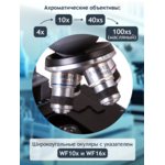 Ахроматичните обективи осигуряват остро и изключително детайлно изображение без аберации. При максимално увеличение с обектив 100x можете да приложите изследователския метод с имерсионно масло. Два широкоъгълни окуляра с показалец дават възможност за изследване на образци със сложна структура.