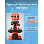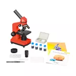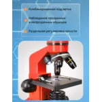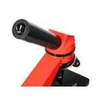 Пластмасовият корпус на този микроскоп е много по-лек от направените от метал – лесно и удобно е микроскопът да се вземе в училище, на разходка или когато отивате у приятели. В същото време микроскопът е много здрав, така че е идеален за интензивна употреба. За да се осигури по-голям комфорт при наблюденията, главата е наклонена на 45°. Осветлението може да се захранва с батерии или от мрежата.