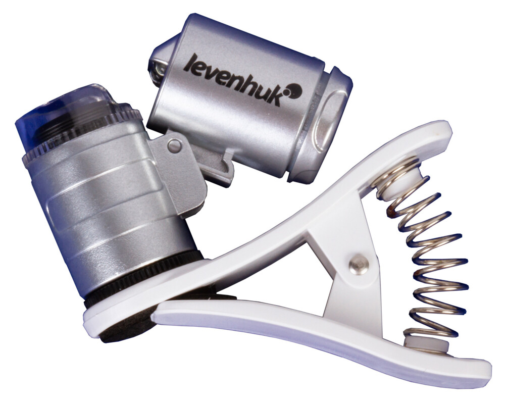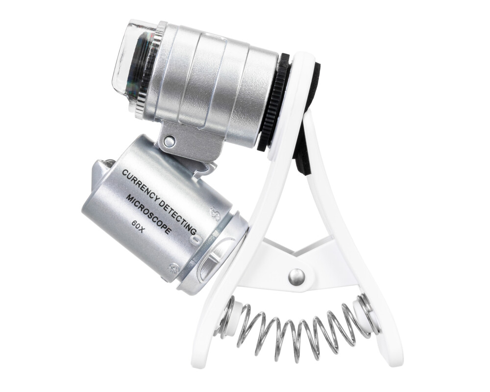 - Джобен микроскоп с щипка за прикрепяне към мобилно устройство