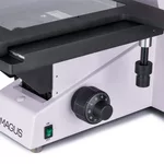 Специална характеристика на микроскопа е голямата предметна маса с размери 280 x 270 mm, с обхват на движение 204 mm по осите X и Y. Фокусирането се регулира чрез въртене на бутоните за грубо и фино фокусиране. Те се движат плавно и надеждно, и благодарение на стойността на деленията на скалата за фино фокусиране е възможна фина работа при големи увеличения. Грубото фокусиране има застопоряващ бутон и регулиране на затягането. Бутоните за фокусиране са разположени в основата на микроскопа и поради това можете да заемете отпусната и удобна позиция. Можете да поставите ръцете си върху масата, вместо да ги държите повдигнати.