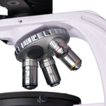 <p>Пет обектива. В свободния слот може да бъде монтиран допълнителен обектив, за да се постигне още по-голямо увеличение. Конструкцията на револверната глава (“настрани от наблюдаващия”) освобождава място в предната част на предметната маса, така че потребителят да може да вижда поставения в оптичния път обектив. Слотовете на револверната глава са центрирани, за да се подравнят оптичните оси на обектива и микроскопа.</p>