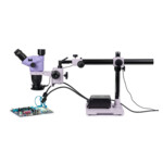 At the end of the stand, there is a mechanism to change the angle of the optical axis. The operator can observe the specimen that is on the table, looking at it from an angle. This feature makes it more convenient to perform manipulations, check the soldering quality, and observe curved objects.</p>