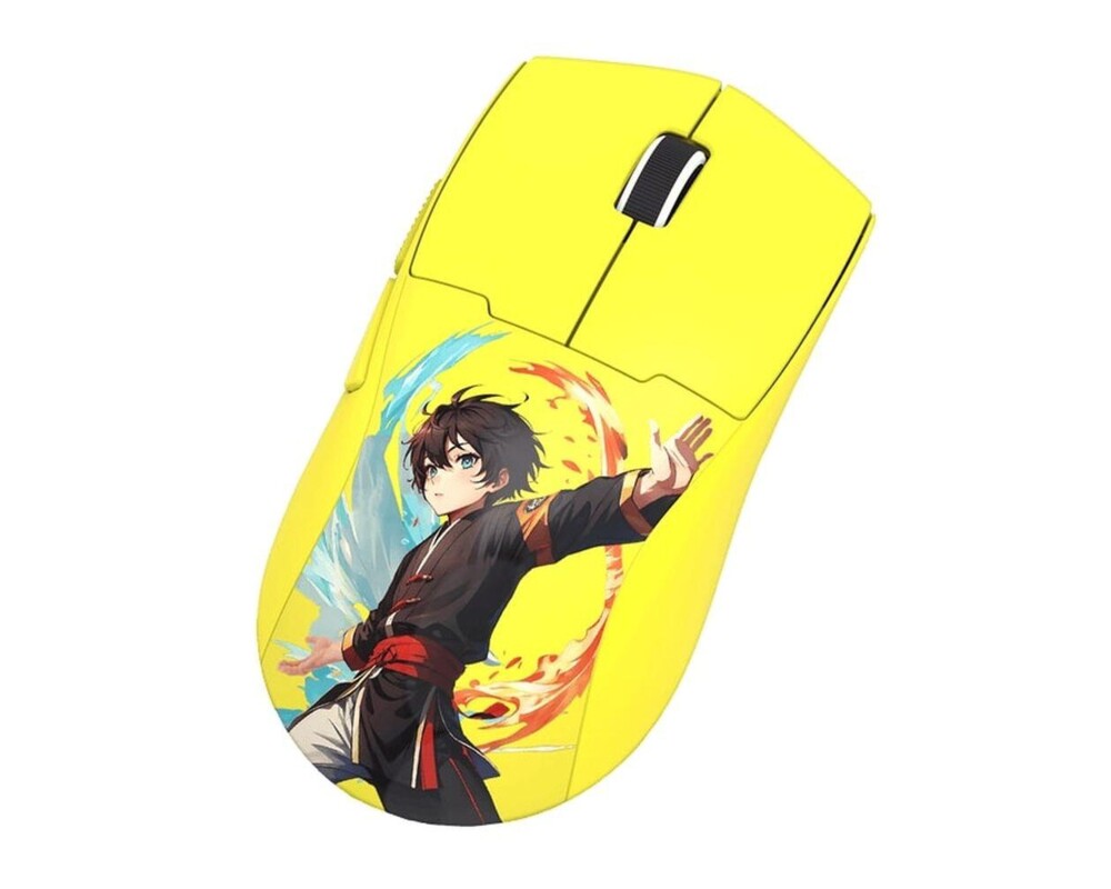 Redragon K1ng Max Anime е жълта геймърска мишка с аниме тема Eisa, която комбинира безжична Bluetooth и жична USB връзка. Създадена за прецизна игра, тя разполага с Pixart PAW3395 оптичен сензор, поддържащ до 26000 DPI, 650 IPS, ускорение от 50G и polling rate от 4000Hz.