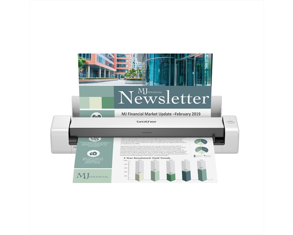 The Brother DS-740D document scanner scans single and double-sided, color and black and white documents in a single pass. - On-the-go scanning