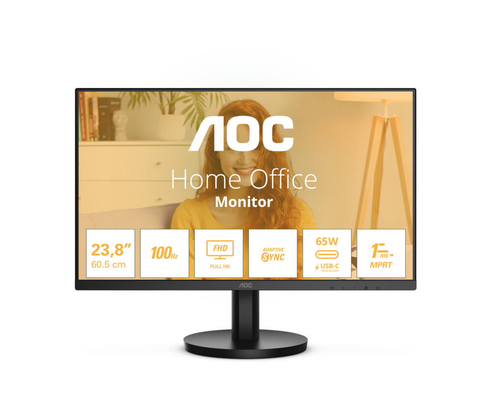 Монитор AOC 24B3CA2, 23.8'' IPS WLED panel, Anti-Glare, FHD 1920x1080, 4ms, 100Hz, 250cd/m2, 1300:1, 20M:1, HDR, Flicker Free, Low Blue Light, Ultra Narrow, HDMI, USB-C, 2x USB, Mic In, PD 65W, Speakers, Tilt, VESA 100, Black