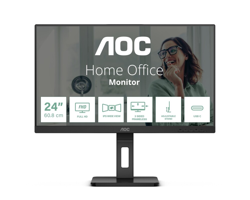 Монитор AOC 24P3CV, 23.8 inch WLED IPS Panel, 16:9, 1920x1080, 300 cd/m2, 1000:1, 50M:1, 75Hz, AntiGlare, 3H, 3-sided frameless, HDMI, DisplayPort, 4x USB 3.2, USB-C Docking, 65W PD, LAN, Speakers, Tilt, Swivel, Pivot, HAS, Flicker-free, Low blue light, VESA 100, Black