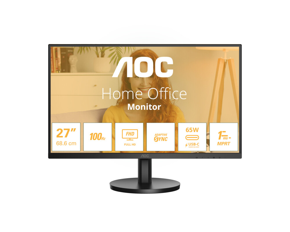 Монитор AOC 27B3CA2, 27'' IPS WLED panel, Anti-Glare, FHD 1920x1080, 1ms, 100Hz, 250cd/m2, 1300:1, 20M:1, HDR, Low Blue Light, Ultra Narrow, sRGB, BT 709, HDMI, USB-C, 2x USB, Mic In, PD 65W, Speakers, Tilt, VESA 100, Black