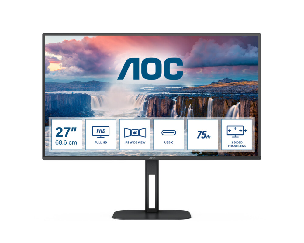 Монитор AOC 27V5CE/BK, 27'' WLED IPS Panel, 1920x1080, 16:9, 4ms, 300cd/m2, 1000:1, 20M:1, Anti Glare, 3H, 3-sided frameless, FreeSync, Flicker-free, Low blue light, Tilt, VESA 100, HDMI, USB-C, 4x USB, Speakers, Black